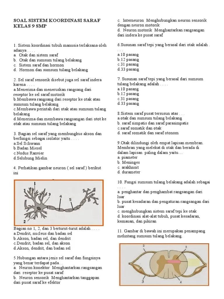 Berikut ini adalah soal pilihan ganda dan kunci jawaban materi sistem koordinasi untuk siswa sma kelas xi. Soal (uraian) materi sistem regulasi dan jawaban. Tuliskan identitas lengkap (nama, nis, no.absen dan kelas) anda cukup. Soal pilihan ganda sistem saraf manusia. Saraf cranial dan saraf spinal c.